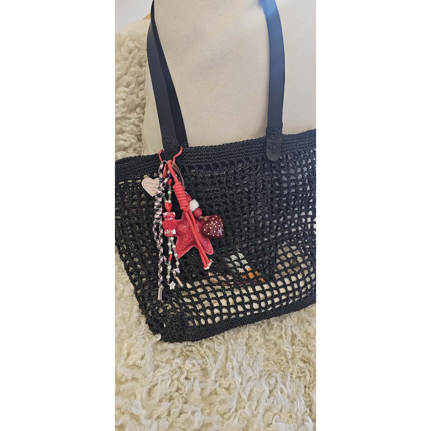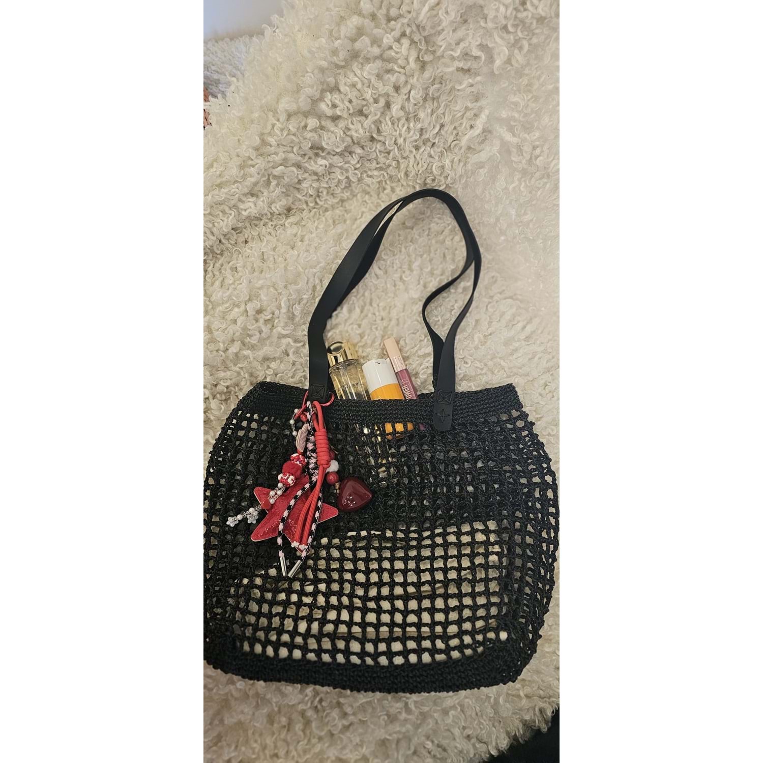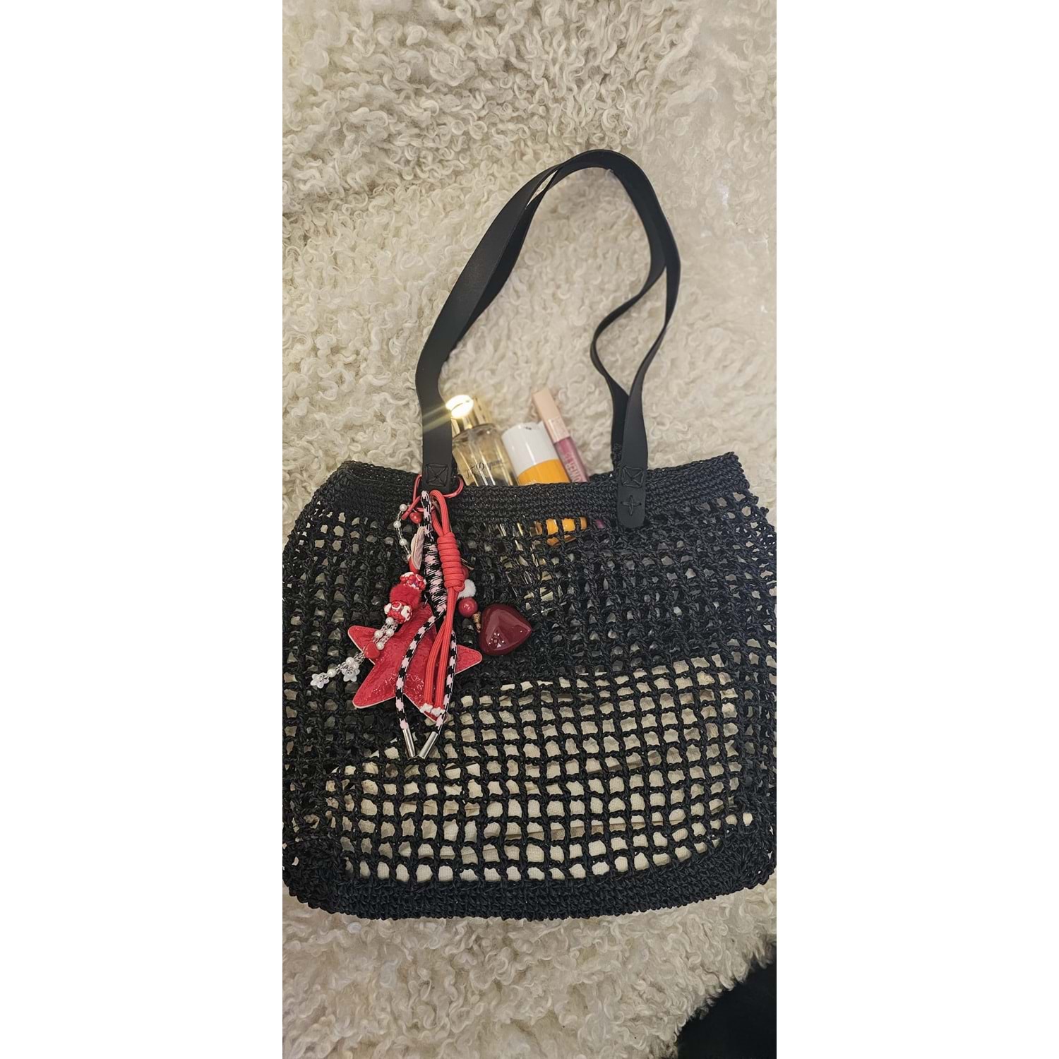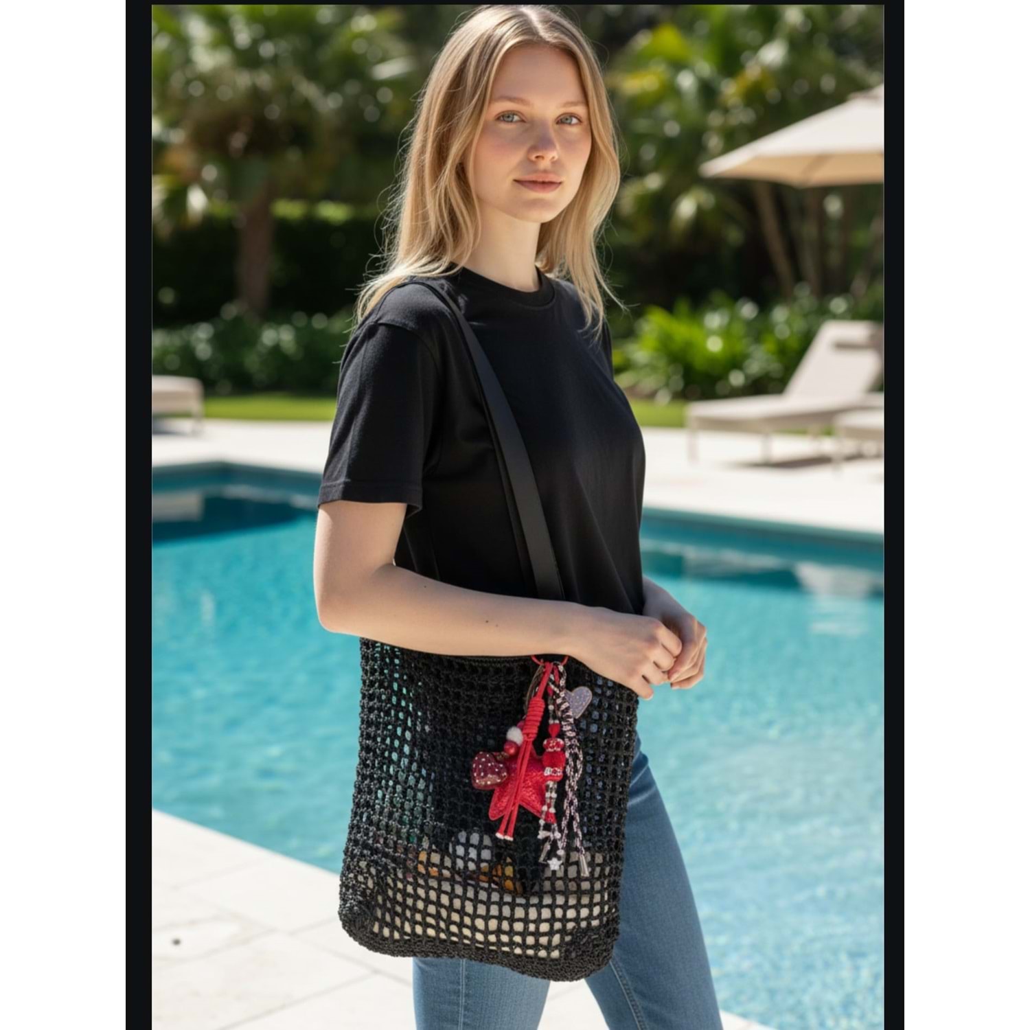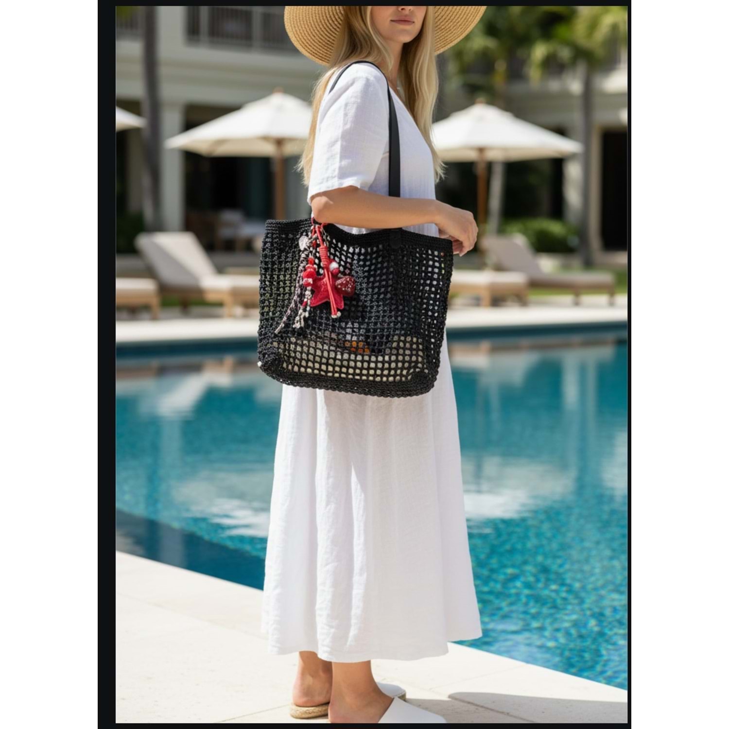 Çift deri saplı kırmızı süslerle bezenmiş kağıt ipten örülmüş spor kıyafetlerinize de eşlik edip plajda yanınızdan ayırmayacağınız sadecde size özel siyah file çanta