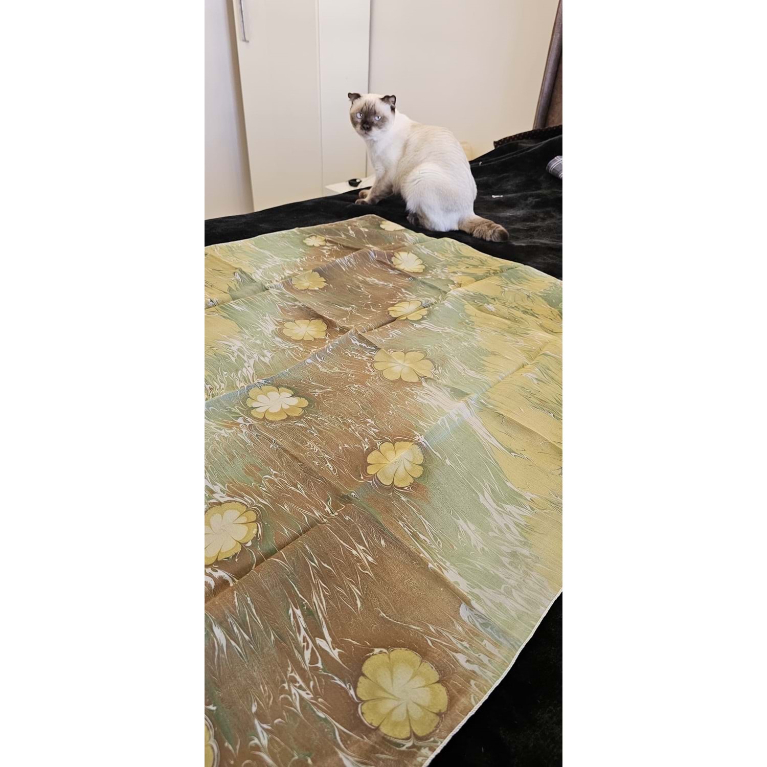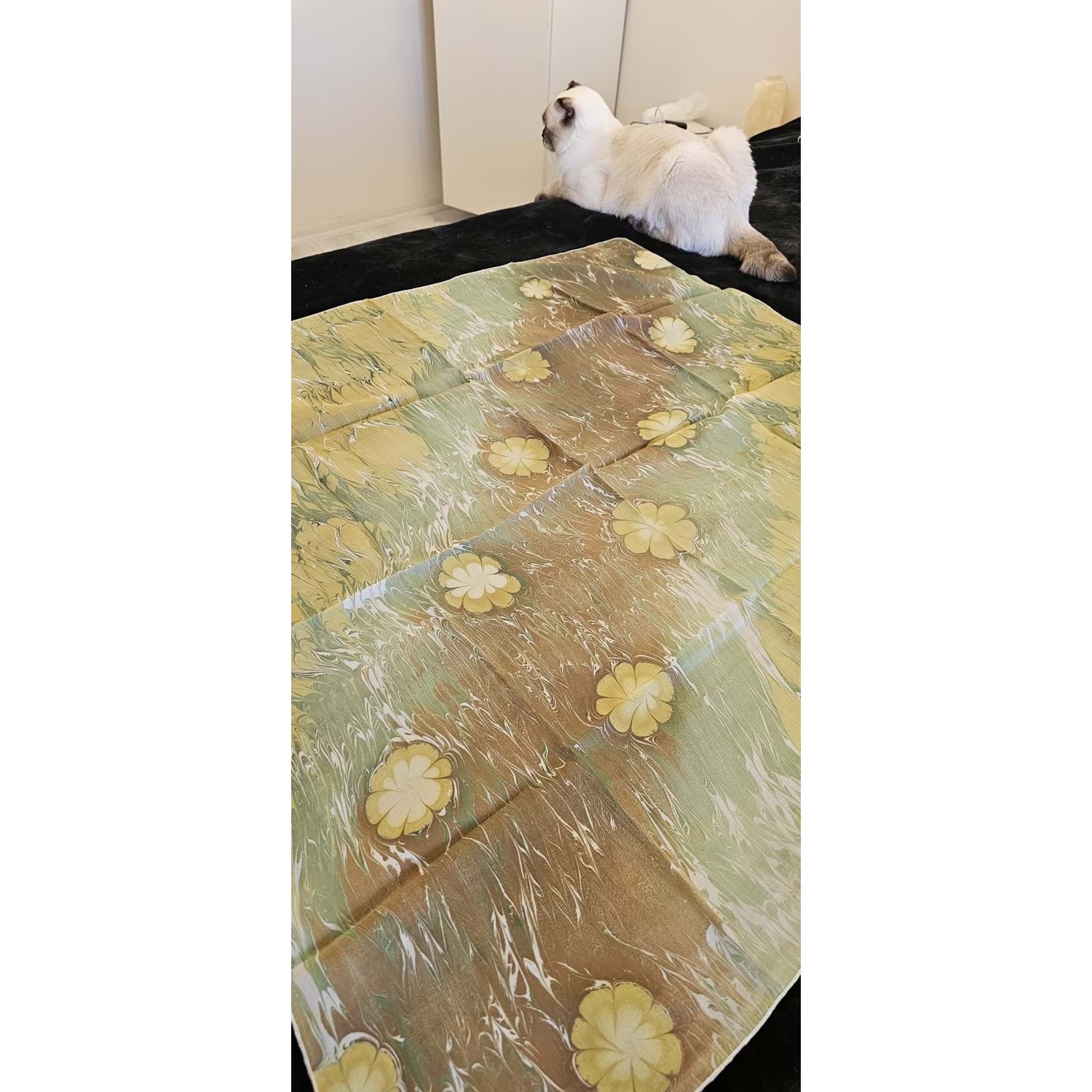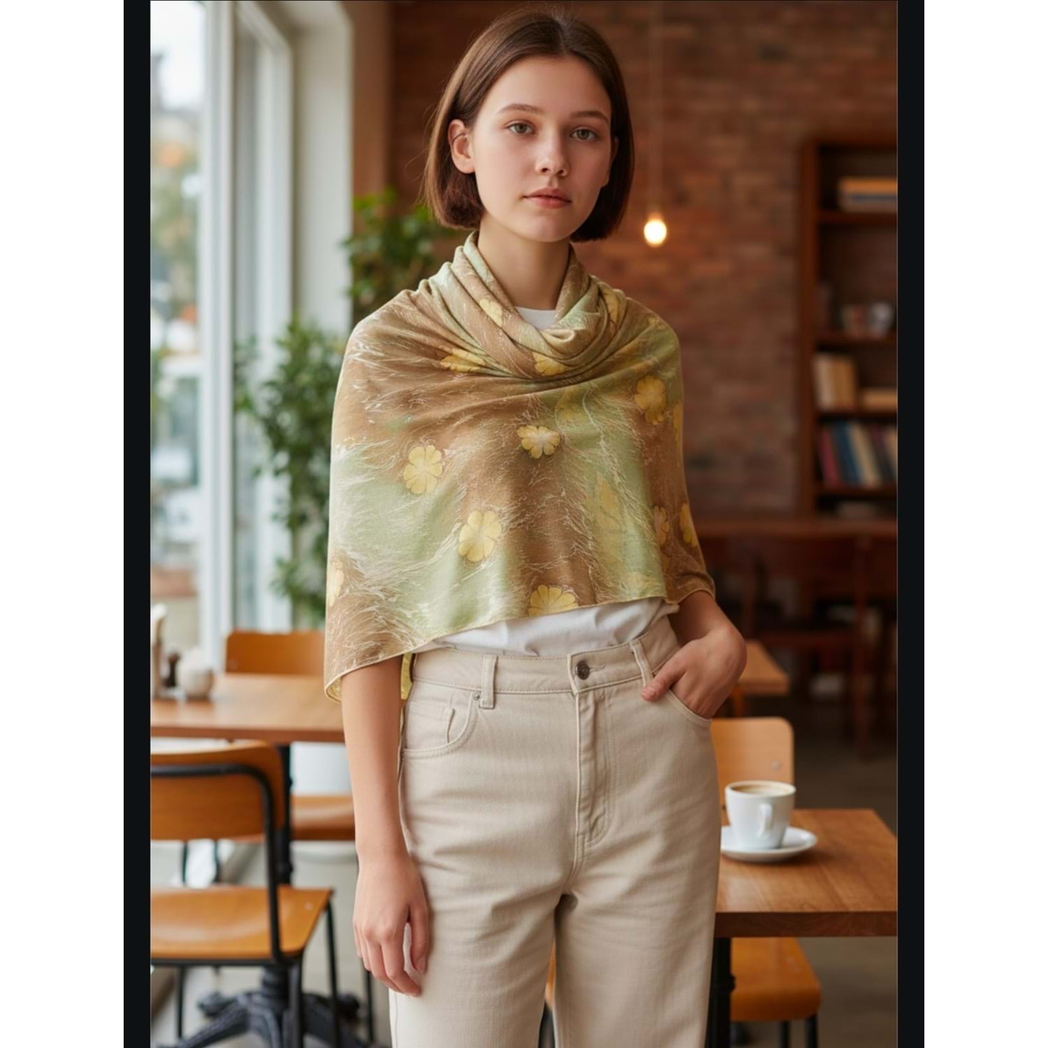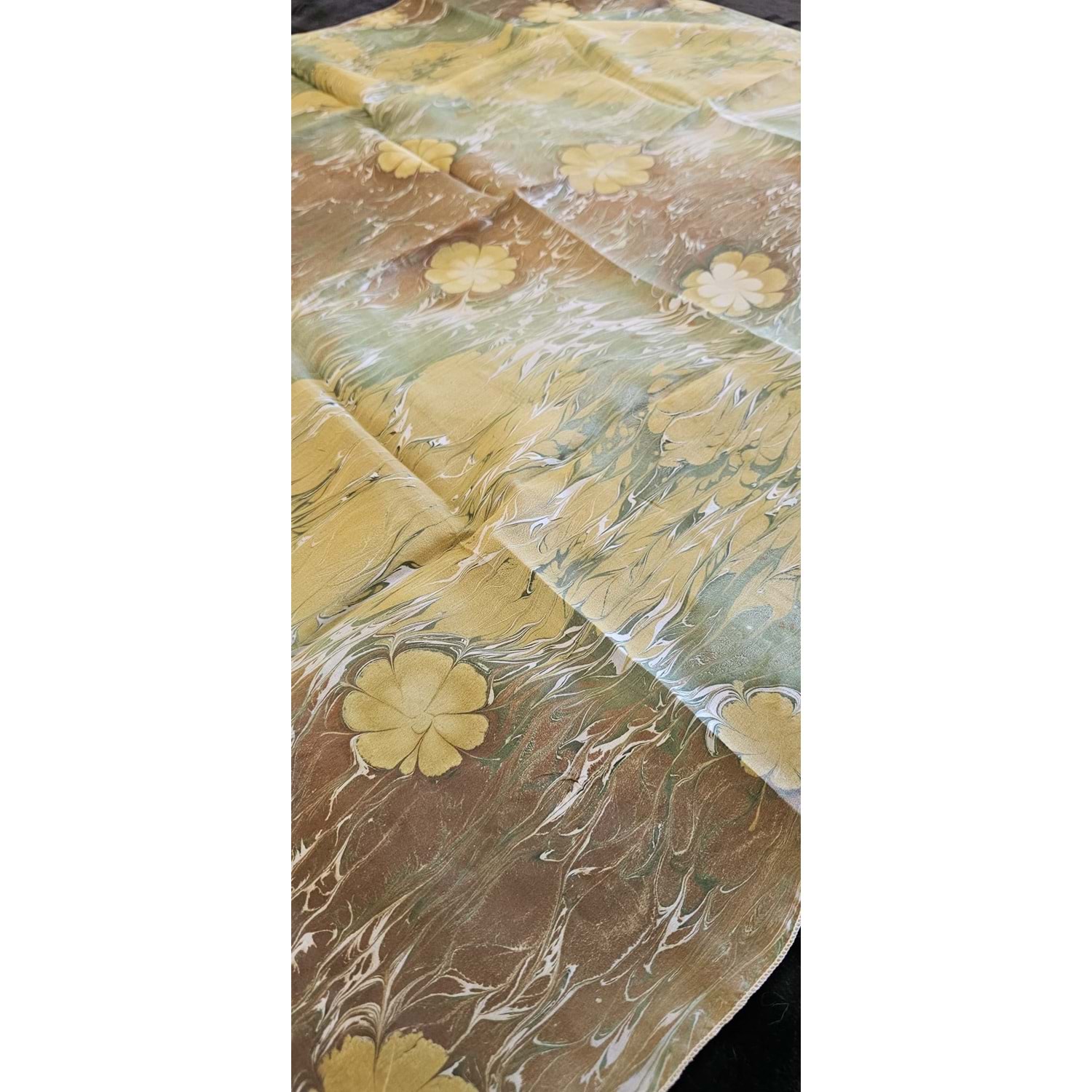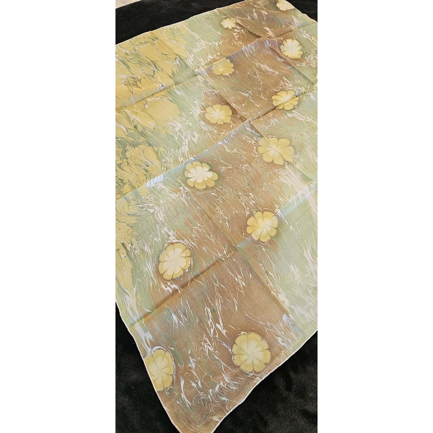 Yeşil Üzerine Sarı Çiçek Desenli Ebru İpek Fular